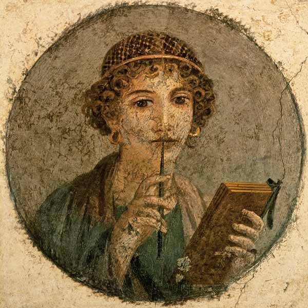 "Le portrait est celui d’une docta puella, une jeune femme éduquée appartenant à la noblesse. Elle tient dans la main droite un stylet et dans la gauche quatre tablettes de bois enduites de cire, support de l’écriture La pose légèrement affectée, avec le stylet sur la bouche, évoque la recherche de l’inspiration..." (Sandrine Bernardeau, historienne de l'art)